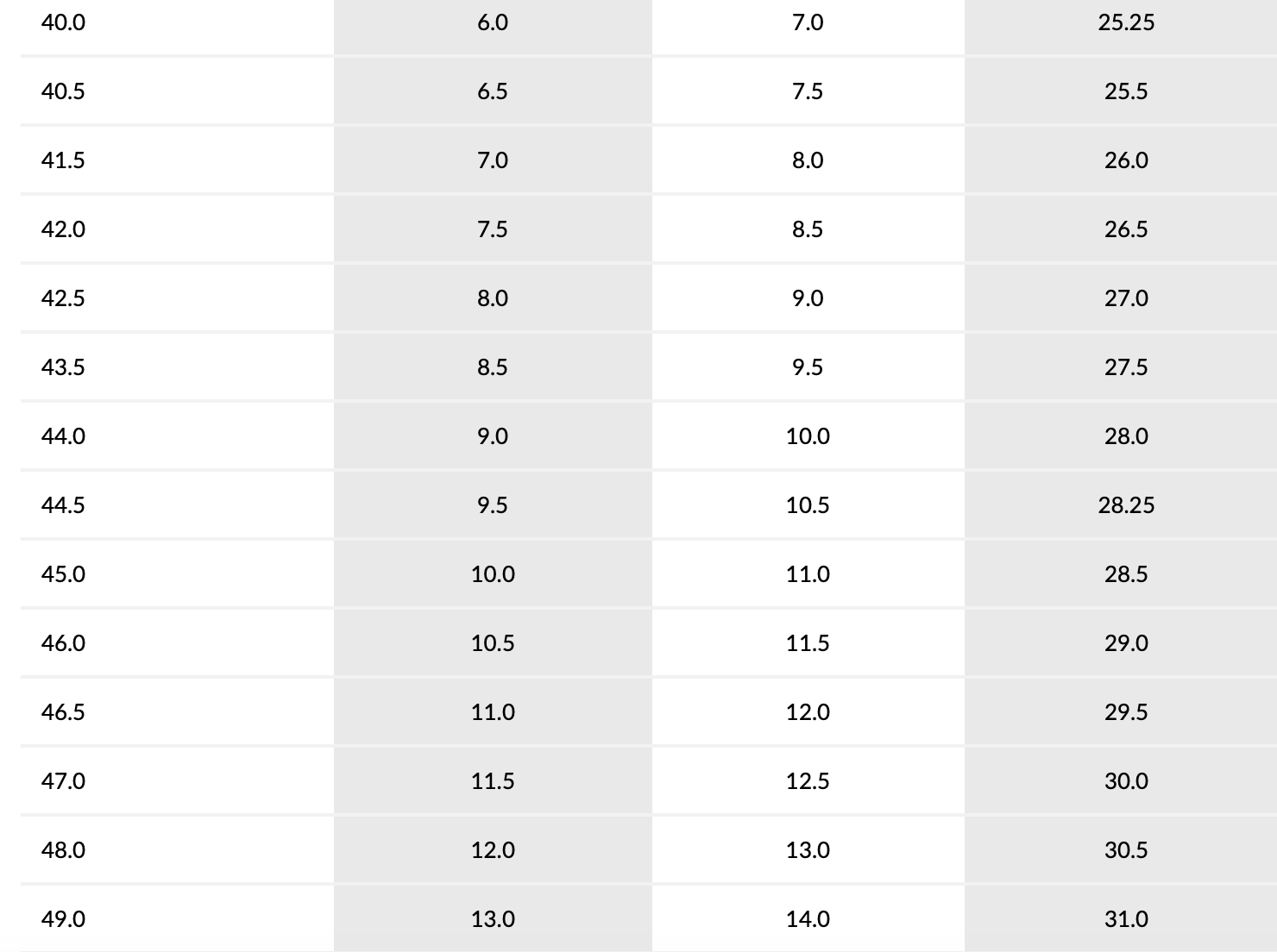 Таблица размеров