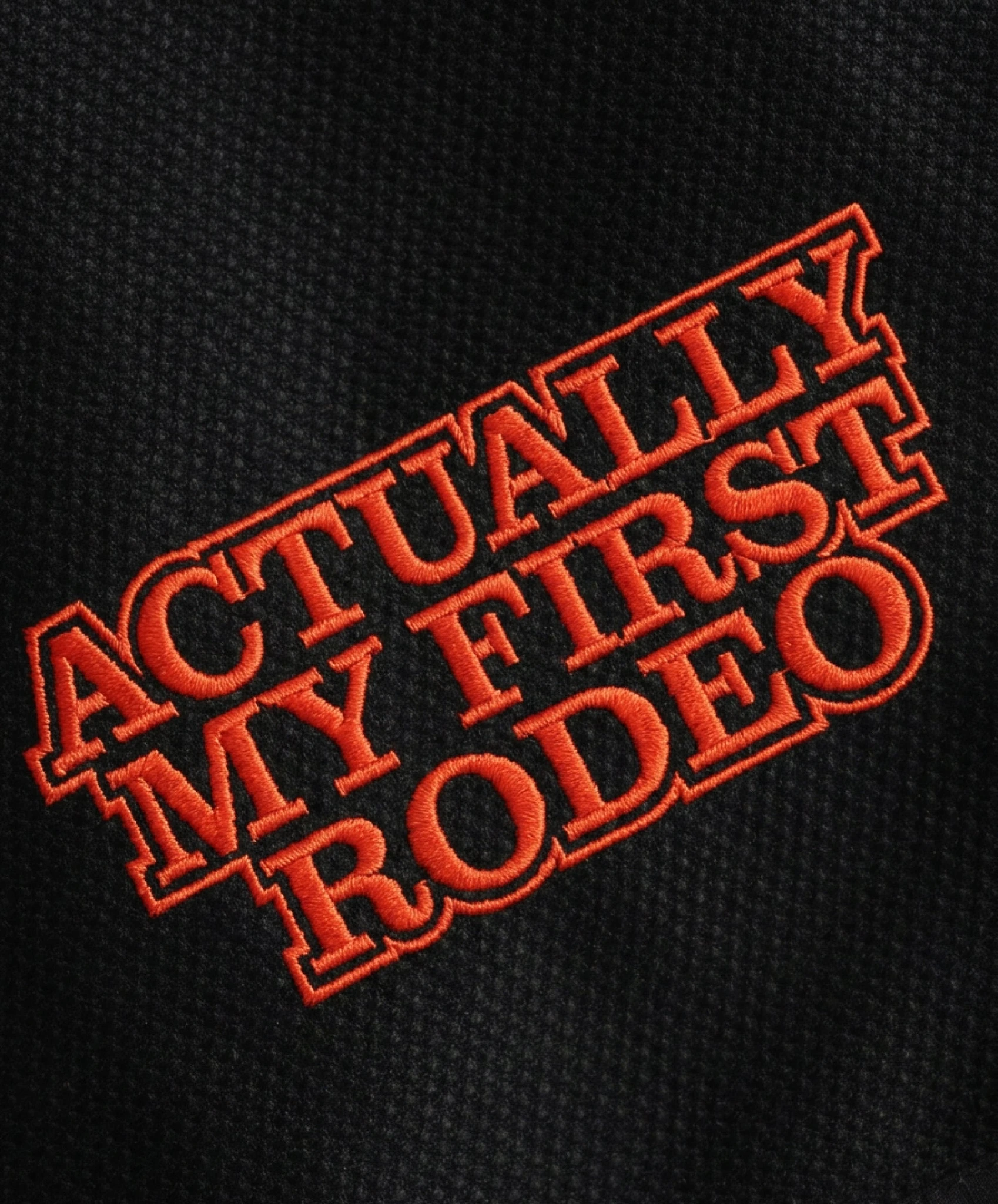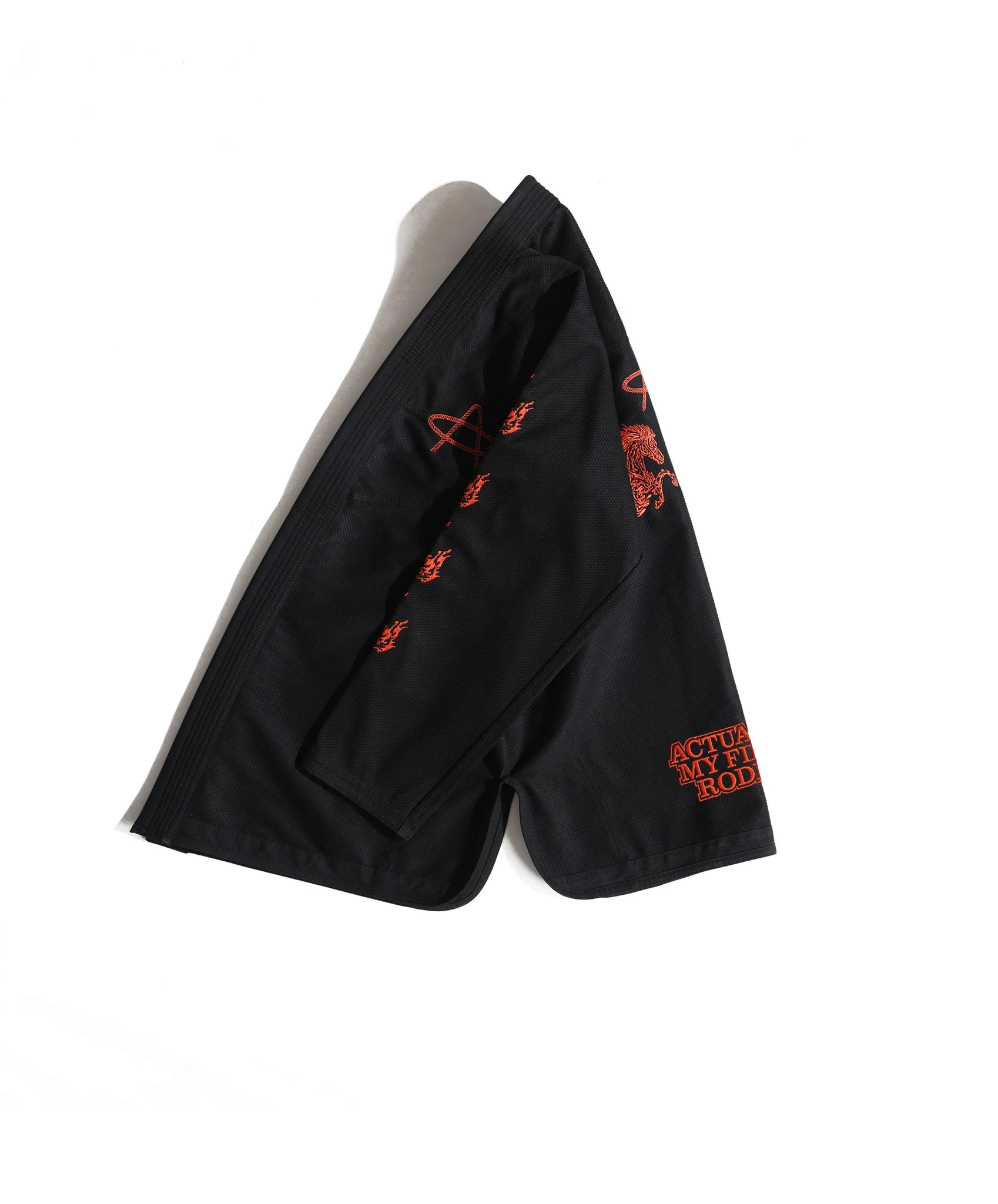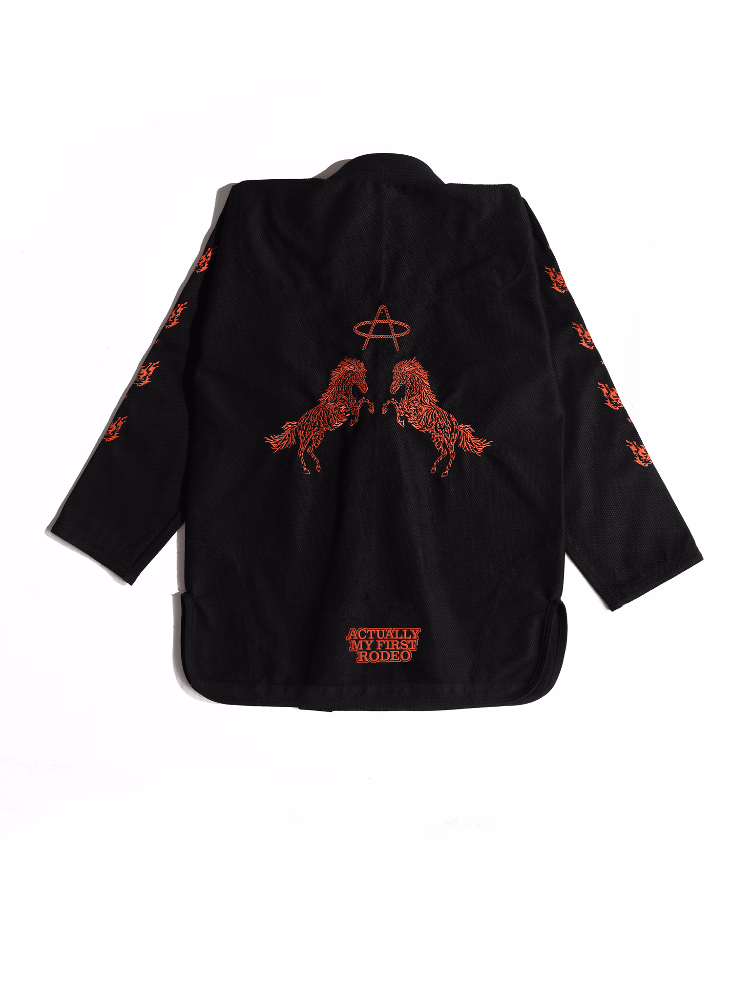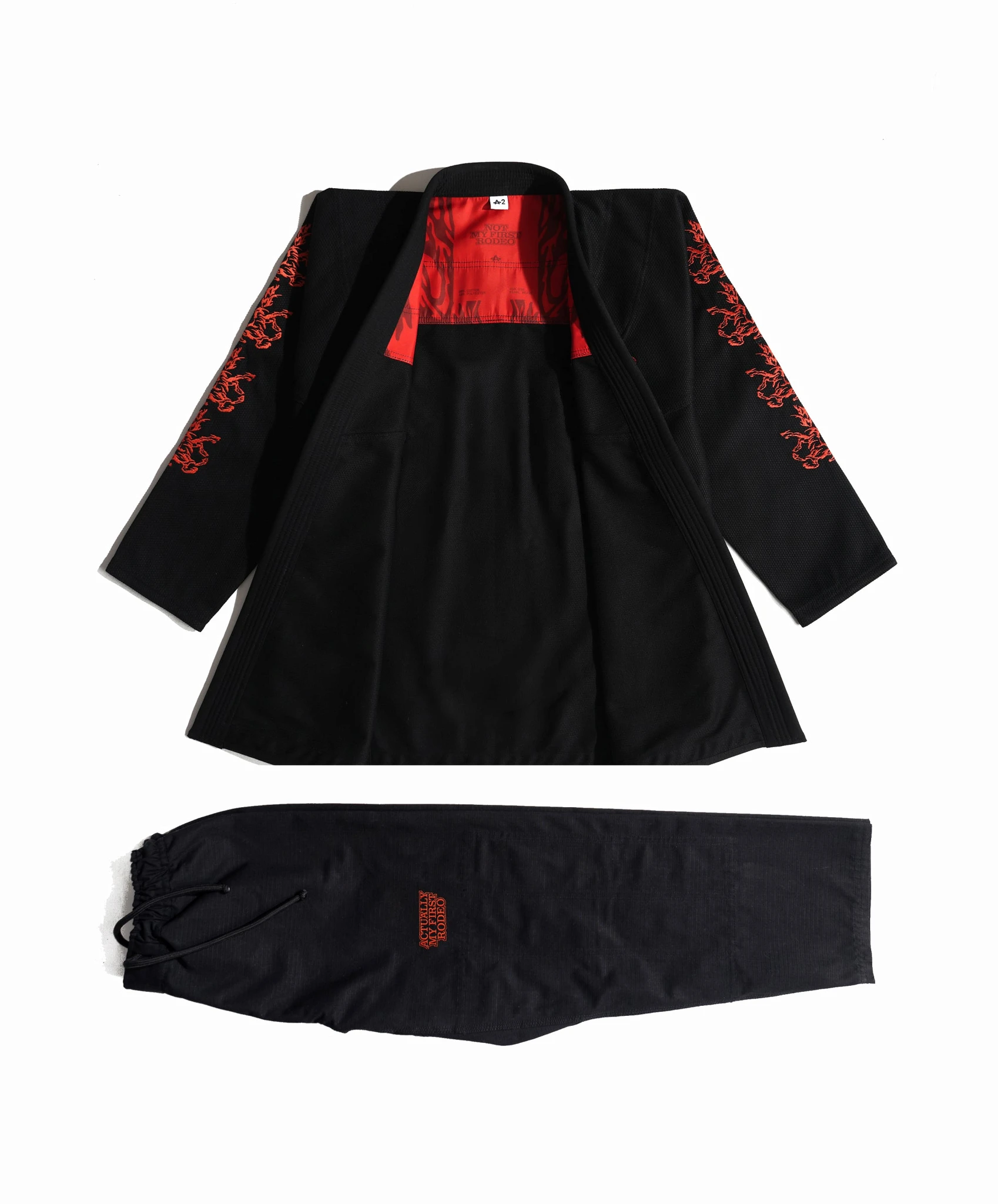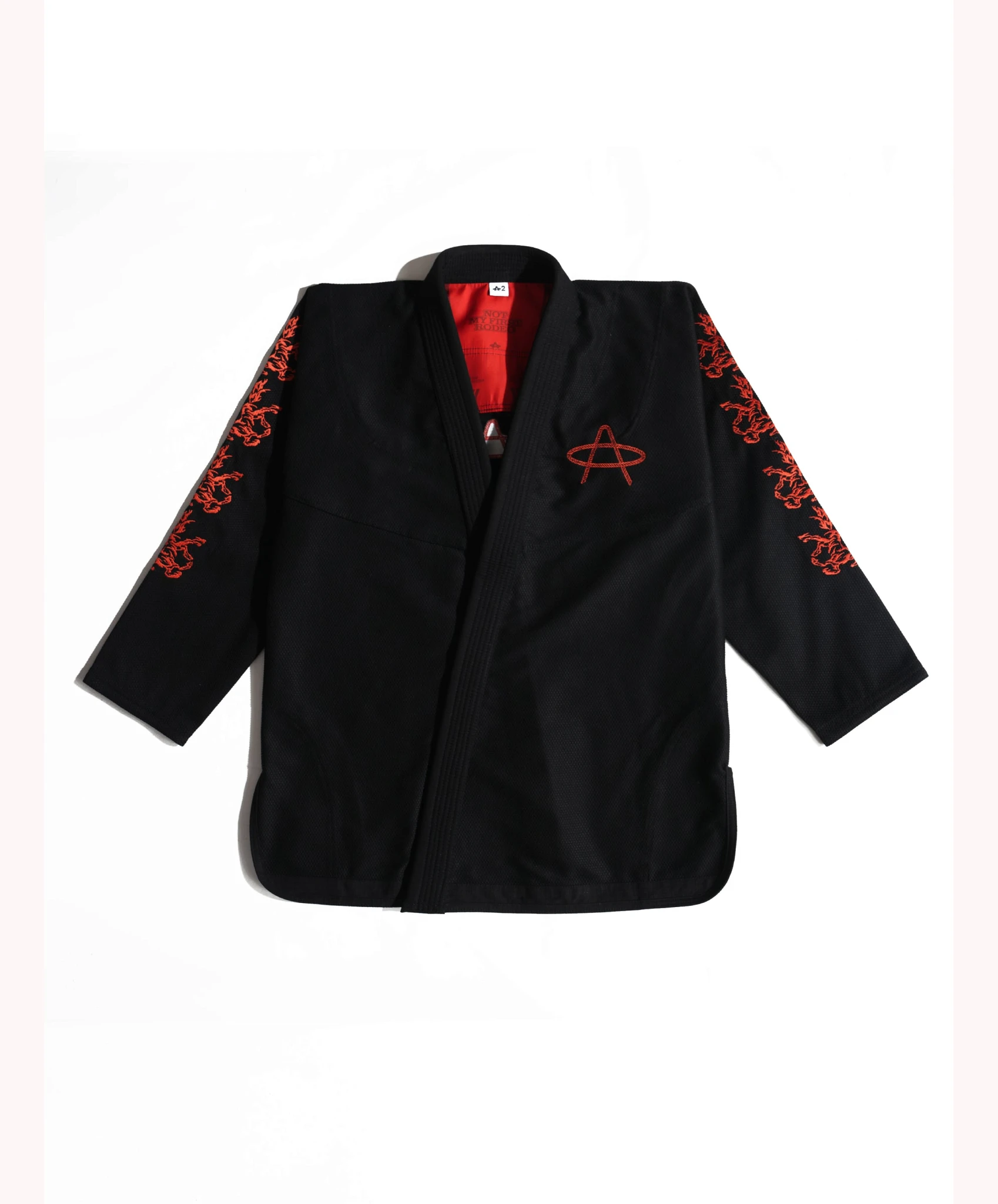 Лассо вокруг "А" на груди. Лошади на обоих рукавах. Та же приподнятая деталь веревочного стежка, что и его старший брат, черный "Not My First Rodeo" gi. Такое же жемчужное плетение 450 GSM. Та же красная атласная подкладка, которая шепчет из воротника, в то время как кто-то у тебя в кресте, имя которого ты еще не знаешь.