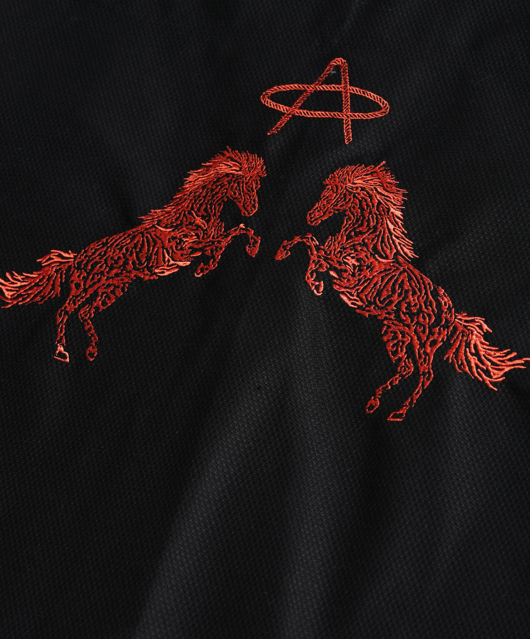 Оранжевая вышивка с текстурой веревки. Два поднимающихся лошади лицом друг к другу сзади — ни всадника, ни ковбоя, только сырая энергия, ожидающая направления. Это ты прямо сейчас. Весь потенциал, ноль извинений.