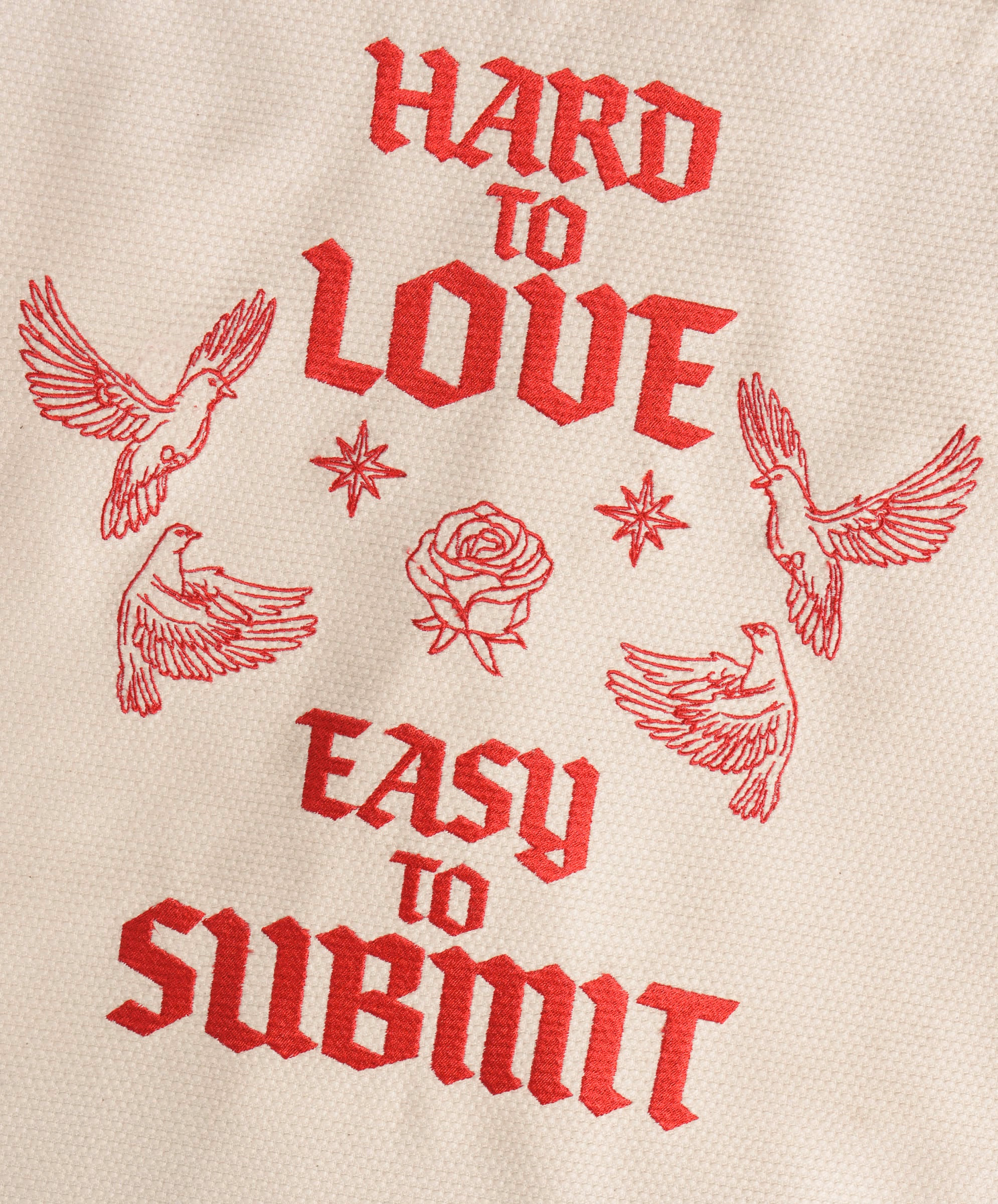Кремовая базовая ткань встречается с красной вышивкой с неудобной правдой о вашей личности.