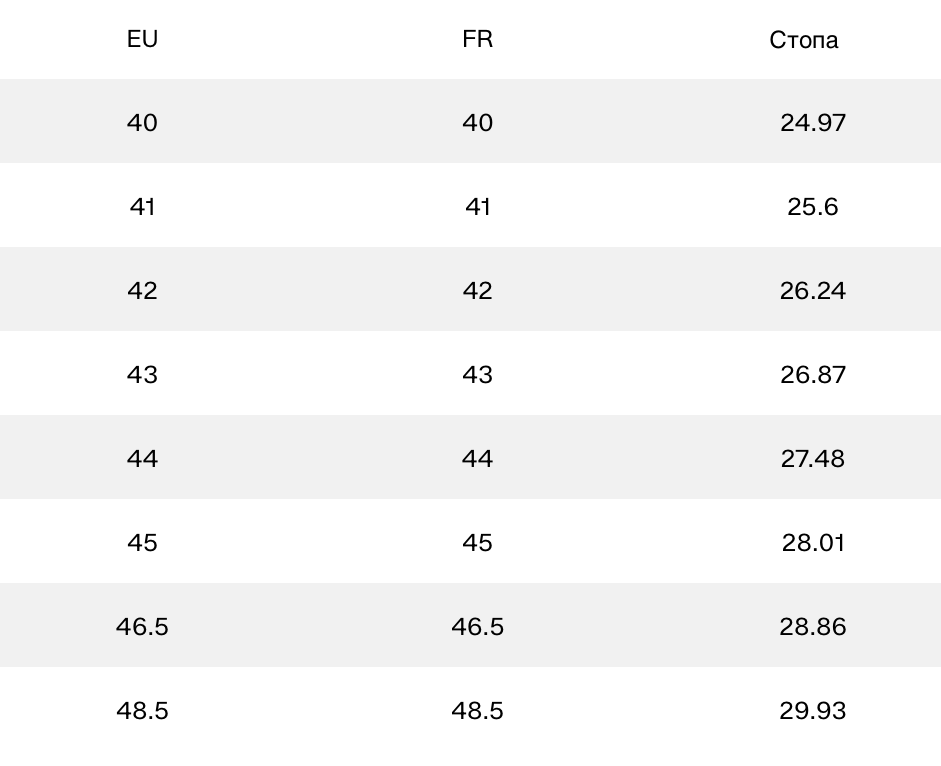 Таблица размеров
