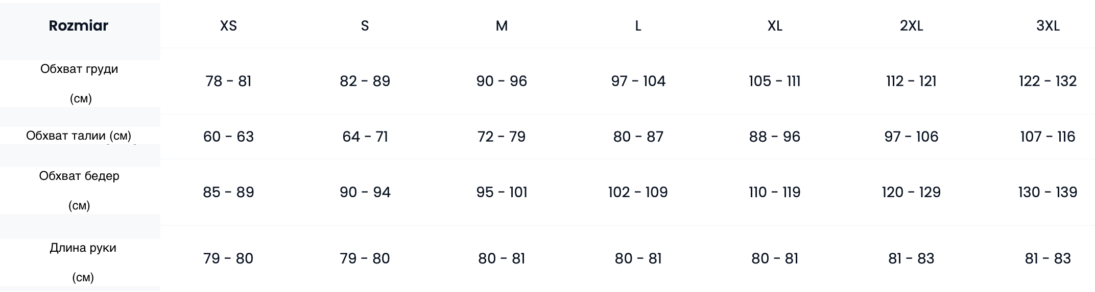 Таблица размеров