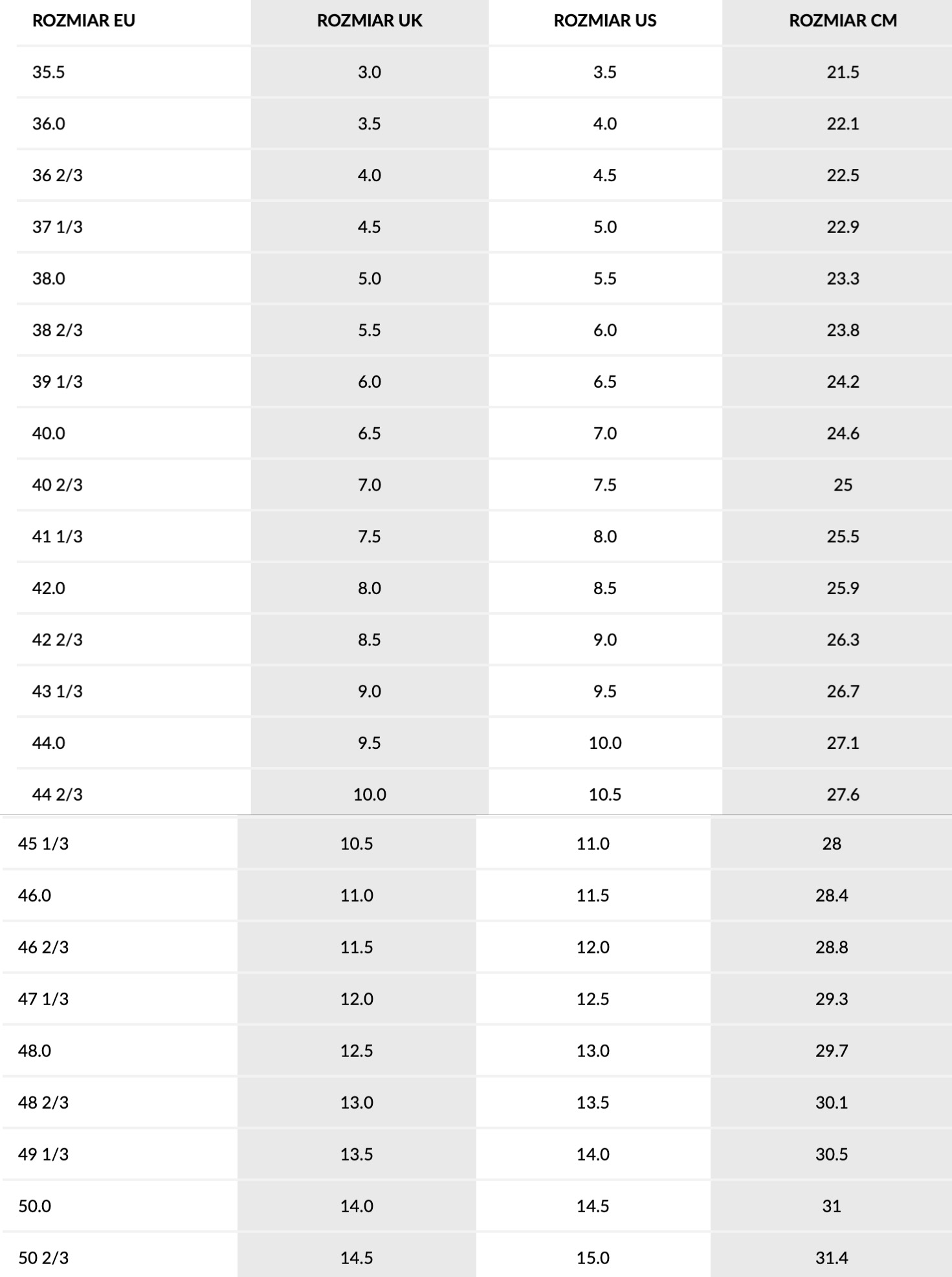 Таблица размеров
