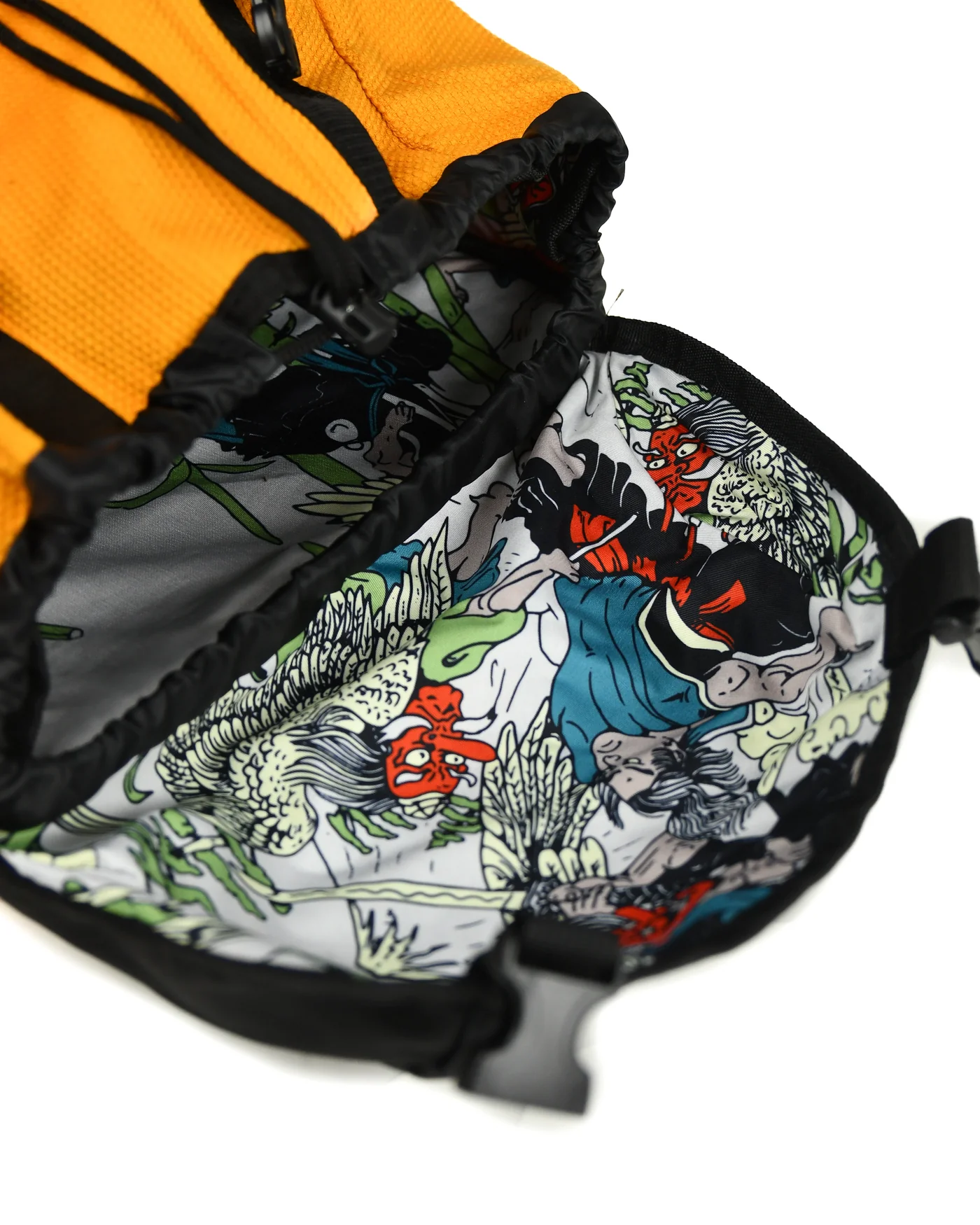 Водонепроницаемая нейлоновая подкладка позволяет хранить потное тренировочное снаряжение без утечки влаги, а также изготовленные на заказ произведения искусства в стиле ирезуми, вдохновленные традициями самураев и бушидо.