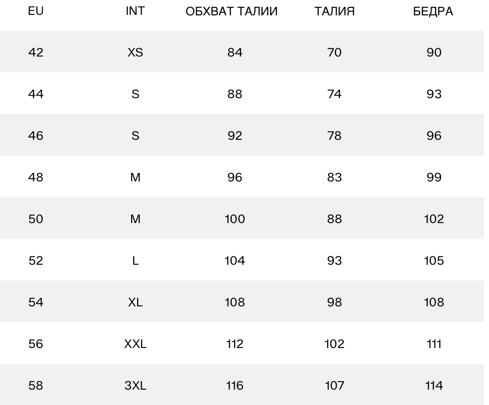 Таблица размеров