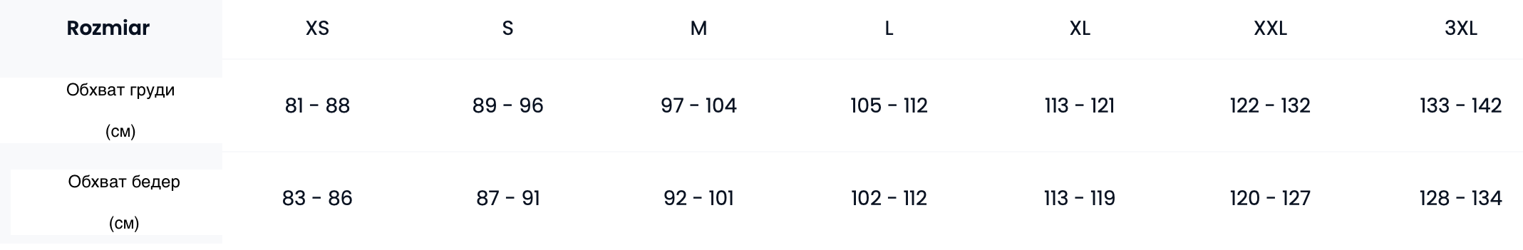 Таблица размеров