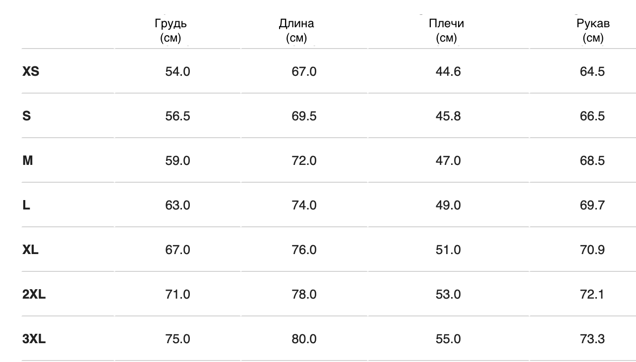 Таблица размеров